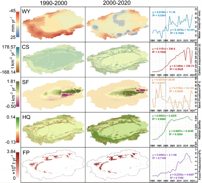 图3. 塔里木河流域生态输水前后ESs空间变化趋势。WY代表产水量,CS代表固碳量,SF代表防风固沙,HQ代表生境质量,FP代表粮食产量。
