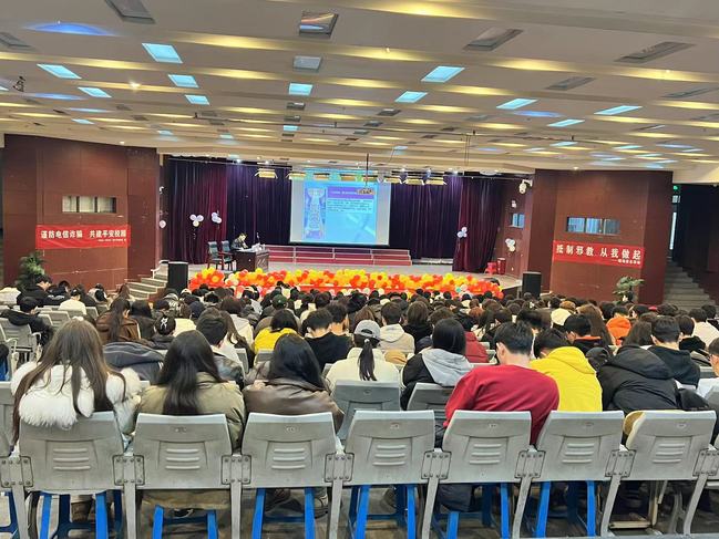 为全面落实校党委有关安全校园的各项要求,增强师生学法、懂法、守法、用法的法律能力,提高师生反诈反邪的意识,切实筑牢校园安全防线,11月15日下午,永利官网在文光校区1号教学楼多媒体教室举行了反诈、反邪宣传进校园活动,活动由文光校区管委会联合新市区政法委、喀什东路管委会、喀什东路派出所联合举办。 高新区(新市区)政法委、高新区(新市区)公安分局、喀什东路管委会、新兴社区有关领导和永利官网文光校区管委会、青年政治学院、预科教育学院等部门学院的300多名师生代表参加本次活动。