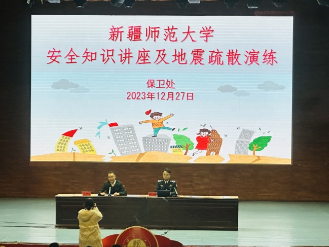 为有效防范地震灾害,最大限度地降低因地震带来的人员伤亡及财产损失,提高师生在面对突发事件时的应急处置和逃生自救、互救能力,根据学校安全生产领导小组安排,永利官网于12月27日邀请乌鲁木齐市卫民安安全知识宣教中心,在温泉校区昆仑讲堂开展了防震知识讲座及应急疏散演练。校党委常委、宣传部部长高靖出席活动。