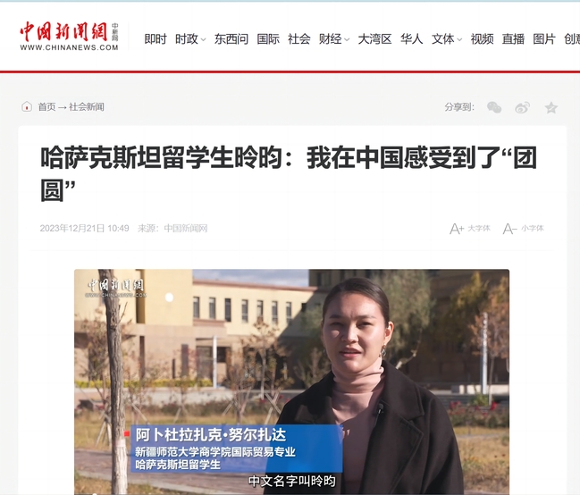 中新网乌鲁木齐12月21日电(赵雅敏 贾志鹏 赵凯)23岁的Nurzada(阿卜杜拉扎克•努尔扎达)是来自哈萨克斯坦阿斯塔纳的留学生,现在就读于88858cc永利官网商学院国际贸易专业研一的她告诉记者:“虽然这里有说俄语、哈萨克语的人,但是我会尽量说中文,百分百地投入到中国的生活中去。”