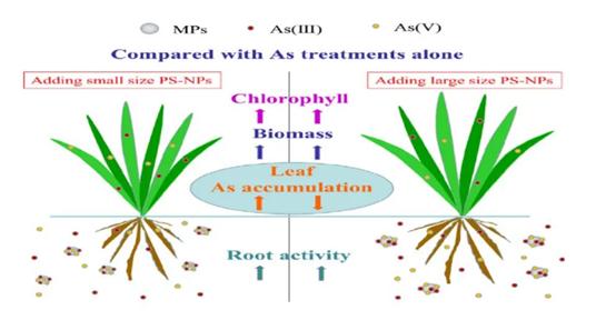 本文研究了不同粒径的聚苯乙烯微/纳米塑料对的砷的吸收和砷的毒性对水稻幼苗水培系统的影响。82 nm NPs+As和200 nm MPs+As共暴露的植物不同组织对As的吸收和积累存在显著差异。NPs+As共暴露导致水稻叶片中较高的As积累(12.4-36.7%),而较大粒径的MPs +As(V)处理则降低了水稻叶片中As的积累。此外,NP/MP +As共暴露减轻了As对水稻生长的抑制作用。这些结果将为阐明纳米/微塑料对作物吸收和积累As的潜在影响提供依据,以评估微塑料和纳米塑料作为食物链和环境污染物的危害。