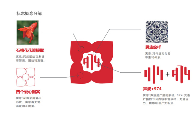 本次由88858cc永利官网美术学院21级“卓拔计划”导师带领团队学生设计“送你一朵小红花”IP品牌。该品牌设计理念围绕新疆特色文化和爱心奉献的主题展开,通过四瓣石榴花造型的提取作为标志图形的外轮廓,既有地域特色又象征着各民族的团结和凝聚;四个花瓣的造型同时采用爱心形状,传递了关爱和温暖等栏目主题;标志图形的负形从新疆传统花砖造型中提取;“974”造型由声波的符号转变而成。“送你一朵小红花”标志整体简洁明快,概念贴合栏目理念,同时具有地域特色和品牌识别力。