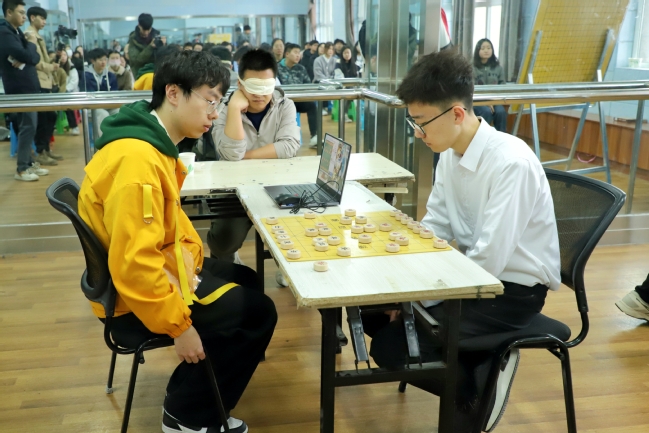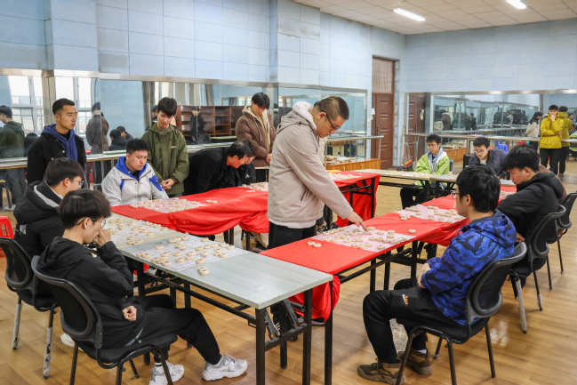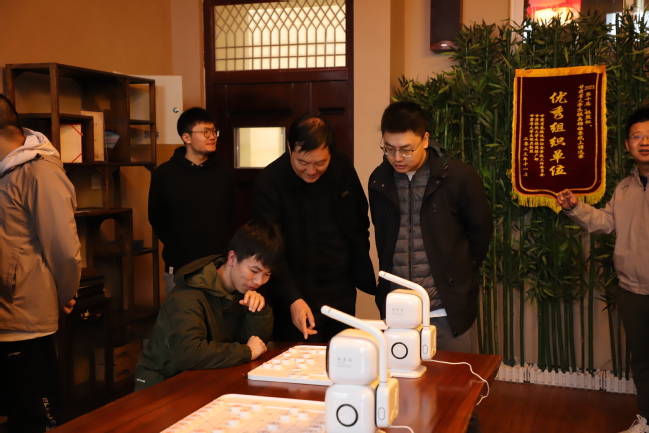 交流座谈结束后,通过“象棋车轮赛”“象棋盲目赛”与棋社同学“切磋”棋艺并进行指导。张欣大师与通幽棋社10位象棋爱好者进行了激烈的车轮大战,学生棋手们围坐一圈,张欣大师穿梭其中,逐一过招。面对国家大师,棋手们聚精会神,举棋若定,认真思考,谨慎落子,最终,张欣大师以9胜1平的战绩结束了本场激烈的“车轮”博弈。