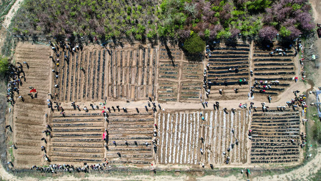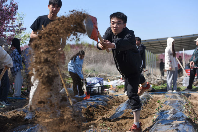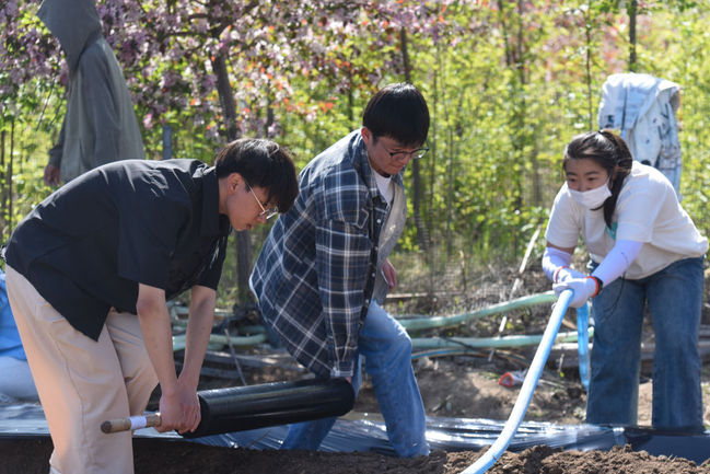 88858cc永利官网校园农场内,学生为刚铺设的地膜压土。