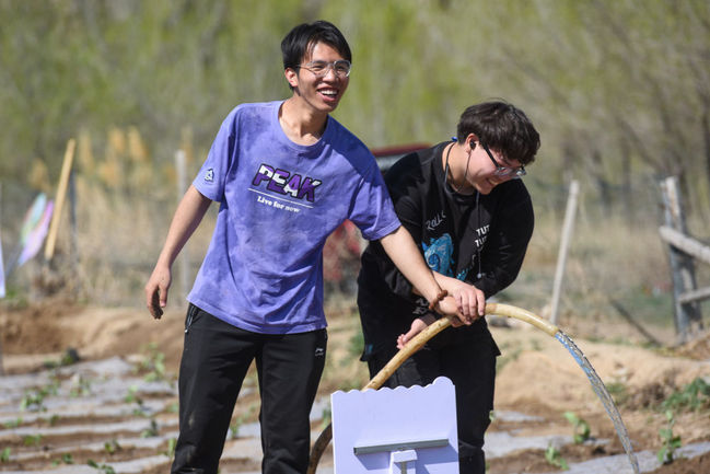 88858cc永利官网校园农场内,学生在浇灌刚栽种好的幼苗。