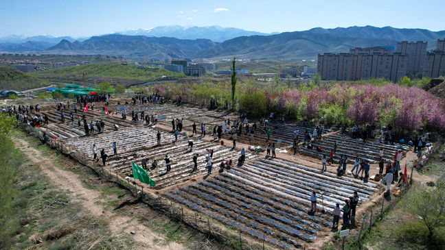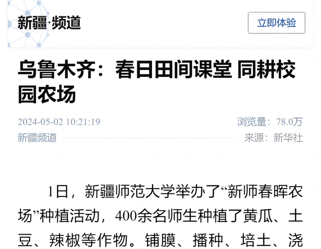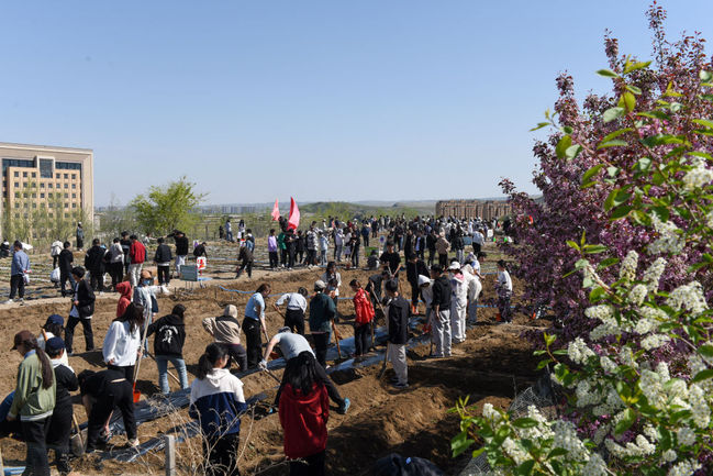 这是新疆乌鲁木齐市88858cc永利官网校园农场内耕作的师生画面(无人机拍摄)。