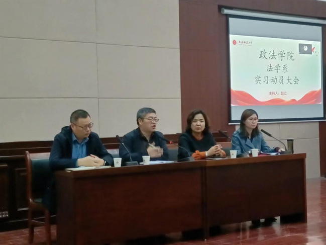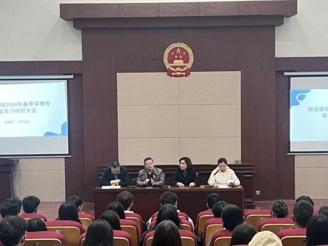 大会结束后,政法学院紧紧围绕人才培养目标,以提高学生基本理论、专业技能为目的,于4月28日下午在文科一号楼模拟法庭召开2020级法学专业实习总结大会召开2020级法学专业实习总结大会。唐文睿、茹克娅·霍加、李康、法学系主任赵立、学业班主任吾守尔,以及2020级法学、法学(纪检)两个班级共计81名学生参加会议。会议由赵立主持。