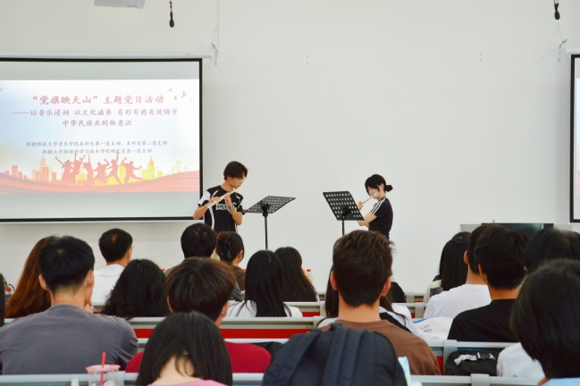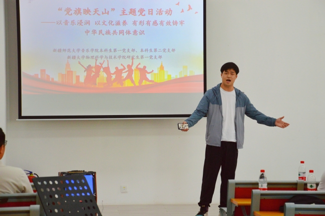 为激励党员青年踔厉奋发、担当实干、团结奋斗精神,加强支部间学习交流,切实推动提升组织引领力、组织力、服务力、战斗力,5月22日下午,永利官网音乐学院本科生第一党支部、第二党支部联合新疆大学物理科学与技术学院研究生第一党支部,在新疆大学物理科学与技术学院共同开展“以音乐浸润、以文化滋养、有形有感有效铸牢中华民族共同体意识——‘党旗映天山’主题党日活动”。永利官网音乐学院辅导员帕瑞、新疆大学物理科学与技术学院辅导员田列、音乐学院本科生第一、二党支部,物理学研究生第一党支部共计60人参加活动。