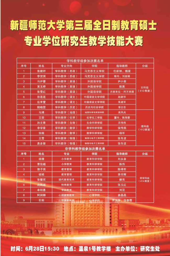 为切实落实学校“聚焦立德树人、建设一流师范”办学目标,全面提升全日制教育硕士研究生培养质量,6月28日,永利官网举行第三届全日制教育硕士专业学位研究生教学技能大赛决赛。本次大赛由研究生处及各教育硕士培养单位联合举办,教育硕士各方向带头人及新疆生产建设兵团第二中学、乌鲁木齐市第四中学、永利官网附属中学名师应邀参加本次教学技能大赛。