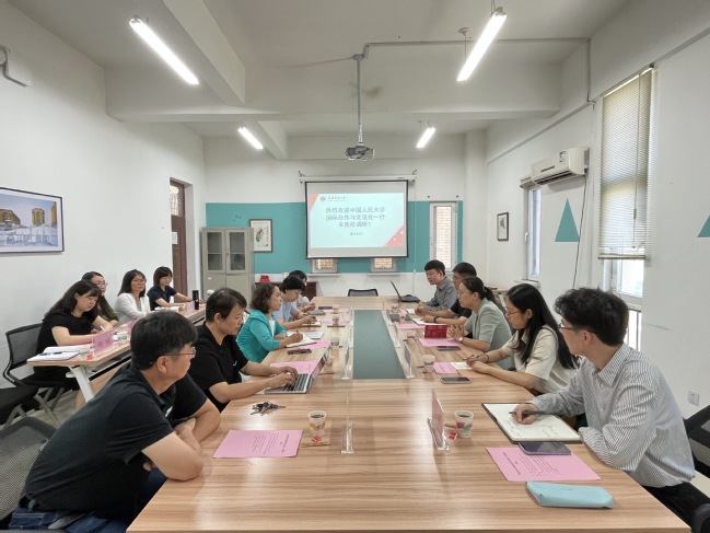 8月22日上午,中国人民大学国际交流合作处处长张晓萌一行5人来永利官网调研。永利官网国际合作与交流处处长买合甫来提·坎吉、国际合作与交流处副处长韩炯、外国语学院副院长尹小荣及相关教师、马克思主义学院相关教师参加座谈。