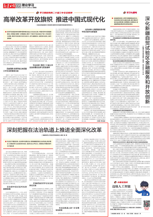 法治是治国理政的基本方式。党的二十届三中全会审议通过的《中共中央关于进一步全面深化改革、推进中国式现代化的决定》(以下简称《决定》)明确将坚持全面依法治国作为进一步全面深化改革的重大原则,强调“在法治轨道上深化改革、推进中国式现代化,做到改革和法治相统一,重大改革于法有据、及时把改革成果上升为法律制度”,提出“必须全面贯彻实施宪法,维护宪法权威,协同推进立法、执法、司法、守法各环节改革,健全法律面前人人平等保障机制,弘扬社会主义法治精神,维护社会公平正义,全面推进国家各方面工作法治化”。改革和法治如鸟之两翼、车之两轮,是全面深化改革和全面依法治国辩证关系的集中体现。在法治下推进改革、在改革中完善法治,能够实现改革与法治的良性互动,促进社会公平正义,从而推动中国式现代化不断前进。