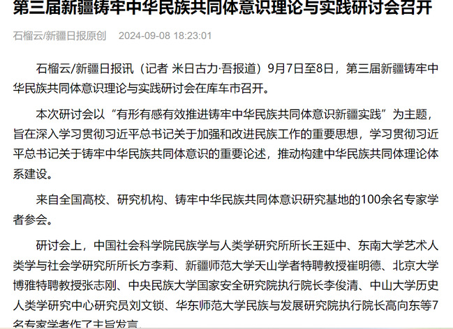 石榴云/新疆日报讯(记者 米日古力·吾报道)9月7日至8日,第三届新疆铸牢中华民族共同体意识理论与实践研讨会在库车市召开。