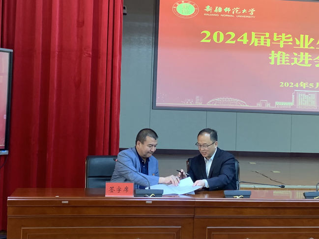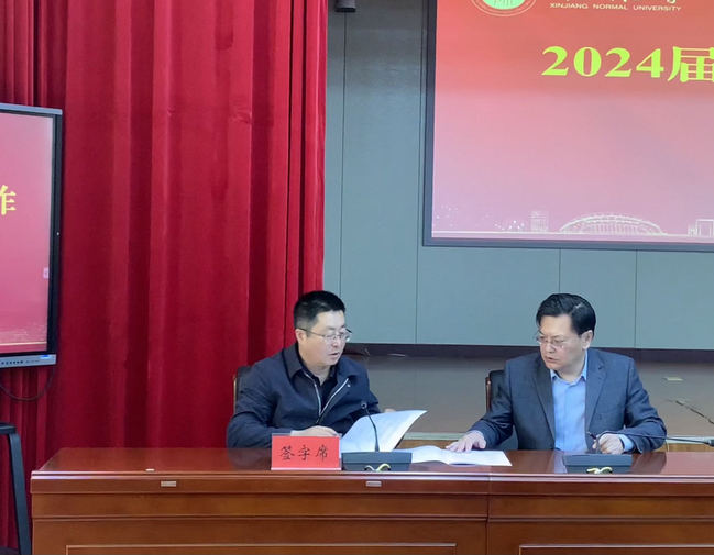 校党委副书记、校长吾满江·艾力出席会议并讲话,会议由校党委副书记刘俊主持。会上,校党委常委、宣传部部长高靖宣读了《88858cc永利官网关于做好2024届毕业生就业创业工作的通知》,历史与社会学院党委书记白丽艳、化学化工学院党委副书记、纪委书记王强华就做好2024届毕业生就业工作作了会议发言。刘俊、高靖分别同美术学院党委书记比拉力江·阿不力孜、中国语言文学学院党委书记陈国栋签订了就业工作目标责任书。
