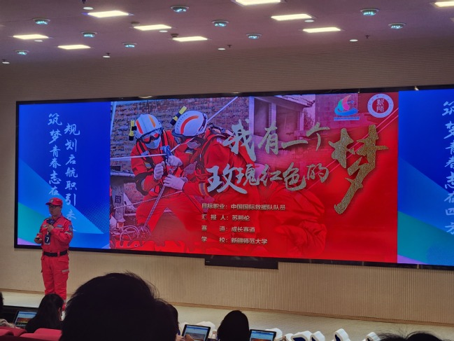 苏熙伦以“国际救援队联络官”为职业目标,以“我有一个玫瑰红色的梦”为题,聚焦翻译专业助力、救援能力保障、志愿服务大美新疆等内容,以习近平总书记关于救援力量建设的要求开篇,从梦想播种、梦想发芽、梦想开花、梦想结果四个阶段呈现了自己成为救援队员的成长与行动。比赛前后,苏熙伦分别接受了中央广播电视总台新闻频道等多家媒体采访,央视新闻客户端刊发了相关报道。