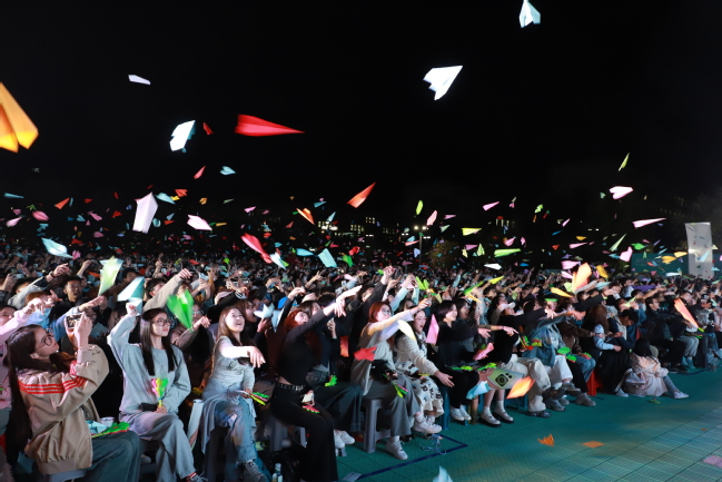 晚会上,各学院教师通过视频向新生送去了真挚的祝愿,新生们也在视频中表达了自己对人生的规划和憧憬。在放飞“心愿飞机”的环节,全体新生手持写有承载梦想和对未来四年大学生活期许的纸飞机,在主持人的带领下,共同将纸飞机飞向远方,掀起了整场晚会的高潮。