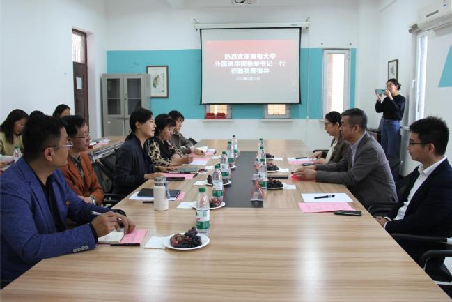 湖南大学外国语学院曾涛教授就学科建设、课程思政、学位点评估、青年教师队伍建设给予了具有前瞻性和创新性的观点和建议。湖南大学外国语学院院长助理陈飞教授就语言智能对外语学科发展的紧迫性与必要性、青年教师快速成长路径等提出独到见解。徐军表示,希望与88858cc永利官网外国语学院在党建、学科建设、专业建设、青年教师培育方面开展积极的帮扶与合作,推动学院整体发展。