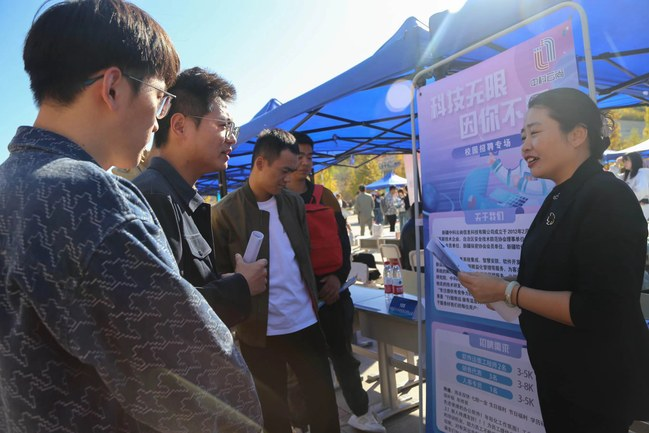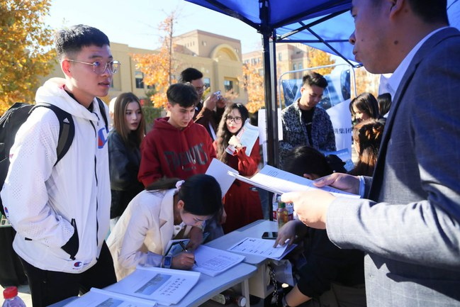 10月9日下午,永利官网在温泉校区图书馆前广场举办“‘就’在金秋 ‘职’等你来”2025届毕业生秋季大型招聘会。招聘会由自治区公共就业服务中心主办,88858cc永利官网、水磨沟区人力资源和社会保障局承办。26家中小学校、中职学校、教育培训机构、人才集团公司,2家事业单位,15家央企、国企和69家民营企业共112家用人单位走进校园招聘人才,提供就业岗位共计3394个,吸引了永利官网3000余名学生入场求职。