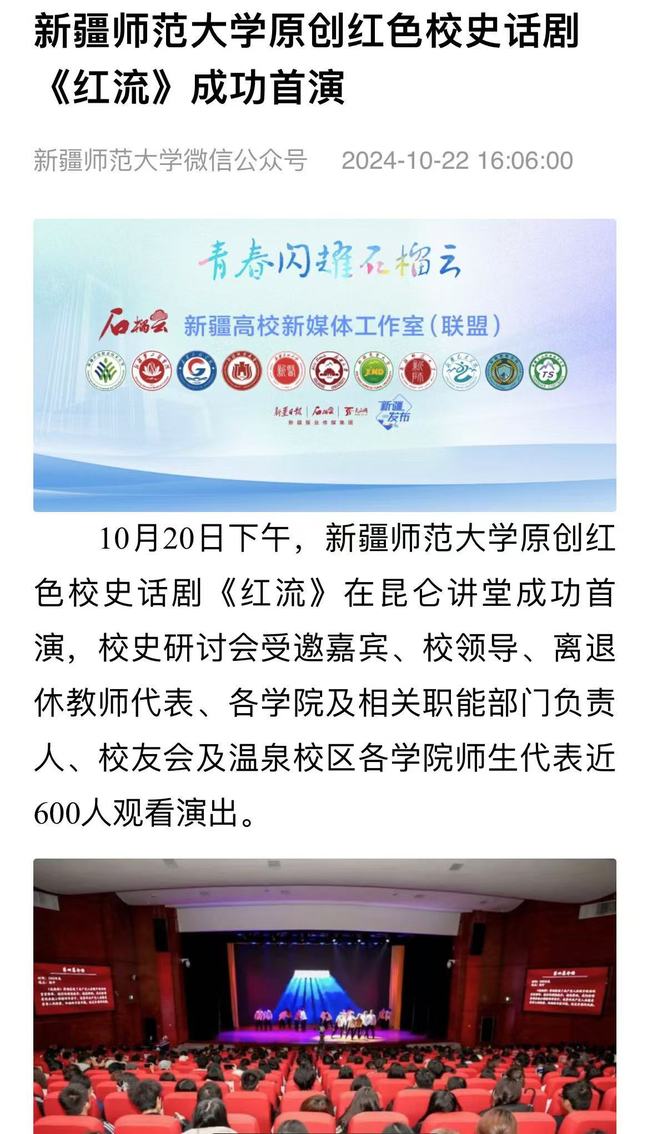 10月20日下午,88858cc永利官网原创红色校史话剧《红流》在昆仑讲堂成功首演,校史研讨会受邀嘉宾、校领导、离退休教师代表、各学院及相关职能部门负责人、校友会及温泉校区各学院师生代表近600人观看演出。