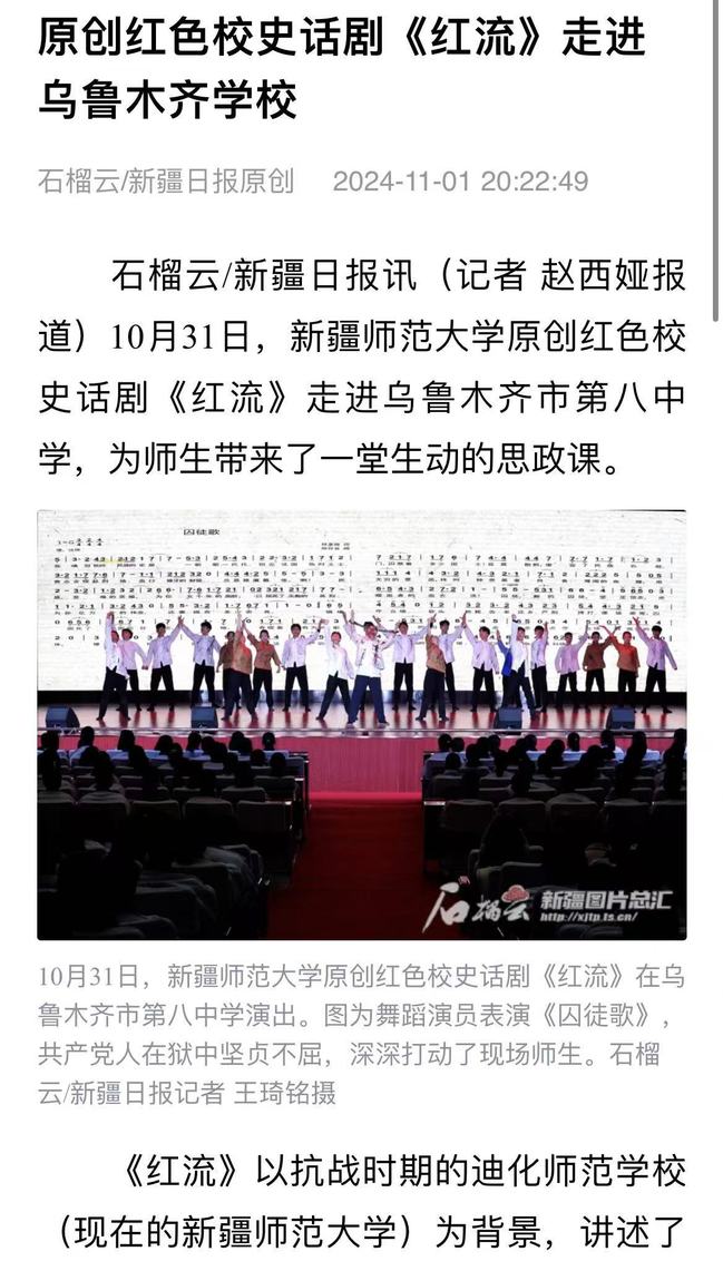 石榴云/新疆日报讯(记者 赵西娅报道)10月31日,88858cc永利官网原创红色校史话剧《红流》走进乌鲁木齐市第八中学,为师生带来了一堂生动的思政课。