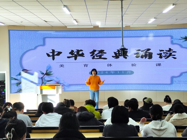 11月12日,宣传部美育中心与中国语言文学学院国学文化教研室联合开展了以“中华经典诵读”为主题的国学体验课程,200 名来自各专业的学生分别在温泉校区笃学楼 118 报告厅和文泽楼国学讲堂参与体验。