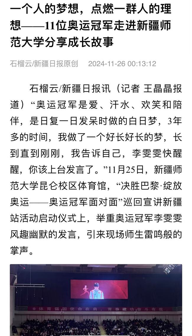 石榴云/新疆日报讯(记者 王晶晶报道)“奥运冠军是爱、汗水、欢笑和陪伴,是日复一日发呆时做的白日梦,3年多的时间,我做了一个好长好长的梦,长到直到刚刚,我告诉自己,李雯雯快醒醒,你该上台发言了。”11月25日,88858cc永利官网昆仑校区体育馆,“决胜巴黎·绽放奥运——奥运冠军面对面”巡回宣讲新疆站活动启动仪式上,举重奥运冠军李雯雯风趣幽默的发言,引来现场师生雷鸣般的掌声。
