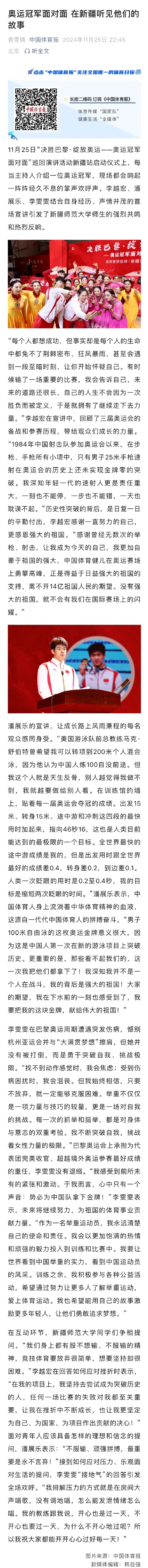 潘展乐的宣讲,让成长路上风雨兼程的每名观众感同身受。“美国游泳队前总教练马克·舒伯特曾希望我可以转项到200米个人混合泳,因为他认为中国人练100自没前途。但我这个人就是天生反骨,别人越觉得我做不到,我就越要做给别人看。在训练馆的墙上,贴着每一届奥运会夺冠的成绩。出发15米、转身15米、途中游和冲刺这四段的最快用时加起来,指向46秒16,这也是人类目前能达到的最极限的一个目标。全世界最快的途中游成绩是我的,但是出发用时跟全世界最好的成绩差0.4,转身差0.2,到边差0.1。人类一次眨眼的用时是0.2至0.4秒,我的目标是缩短两次眨眼的时间。”潘展乐表示,中国体育人身上流淌着中华体育精神的血液,这源自一代代中国体育人的拼搏奋斗。“男子100米自由泳的这枚奥运金牌意义很大,因为这是中国人第一次在新的游泳项目上突破历史。更重要的是,那些看不起我们的,这一次我把他们都拿下了!我深知我并不是一个人在战斗,我的背后是强大的祖国!大家的期望,我在下水前的一刻也感受到了,我要把我的这块金牌,献给伟大的祖国!”