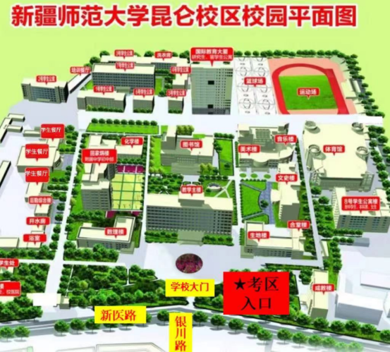 88858cc永利官网考点(6512)分为两个考区:88858cc永利官网昆仑校区文史楼考区(新医路102号)和88858cc永利官网附属中学考区(银川路107号)。考点及考区位置如下图。