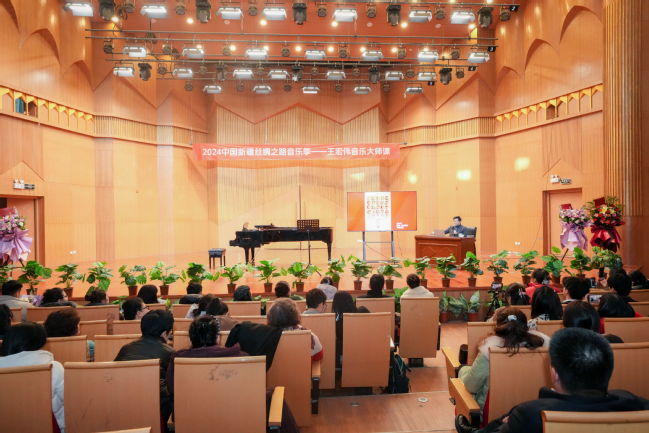 仪式后,王宏伟在永利官网音乐厅为永利官网音乐学院师生代表讲授了“2024中国新疆丝绸之路音乐季‘音乐大师课’”,以《塑造民族歌剧角色的“合度”——表演经验漫谈》为题,通过讲演结合的方式,与在场师生共同剖析经典民族歌剧的创作主旨、剧情背景、角色塑造、唱腔技巧,启发学员们更深入了解民族歌剧。