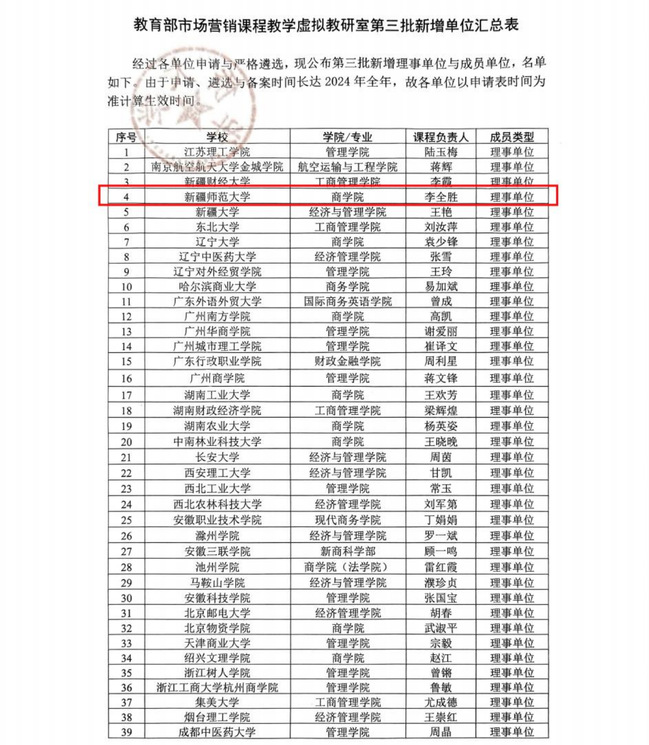 近日,教育部市场营销课程教学虚拟教研室正式公布了第三批理事单位名单,永利官网商学院经申报遴选成功入选,课程负责人为商学院院长李全胜。