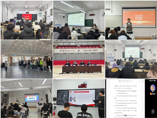 体育学院在体育馆召开考风考纪动员大会。学院领导进行现场动员讲话,并对考试纪律提出明确要求;监考教师代表就公开公平公正的监考工作表态发言;学生代表就诚信考试作出郑重承诺。政法学院和美术学院组织各班级郑重签署了诚信考试承诺书。音乐学院开展了诚信考试宣誓活动。各学院积极引导学生以诚信为本,考出真实水平。